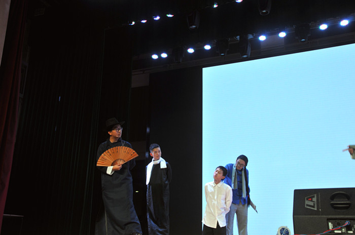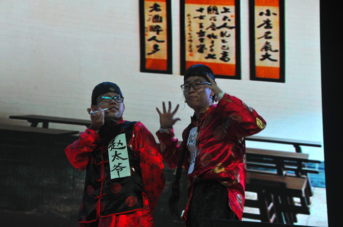 在这次呐喊《编剧》演出中,我班同学集思广益地写出了一篇十分完整的故事。随着阿Q来到了酒馆,发生了一系列不同阶层的人以及不同性格的人的各种摩擦碰撞。演员们不断地揣摩,努力排练,利用了自己的课余时间,为演出贡献了很大的力量。在这个过程中,值得感谢的不仅仅是台上的演员们,更有幕后的工作人员,例如道具、后勤、幻灯片,音效技术制作等等。其次,全班同学为这部剧都提供了自己的想法和建议,让我们能够不断打磨,不断提升整场演出。非常感谢大家的支持和帮助,有了你们才有了这一次精彩的演出。