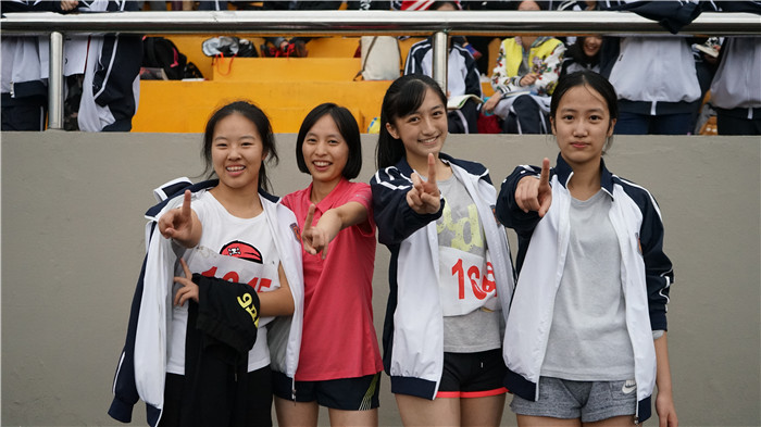 (高三5班4×100m选手合影,从左向右依次为傅潞遥、欧阳姝琪、沈雨辰、马嘉悦) 摄影:高三5 钱文婧