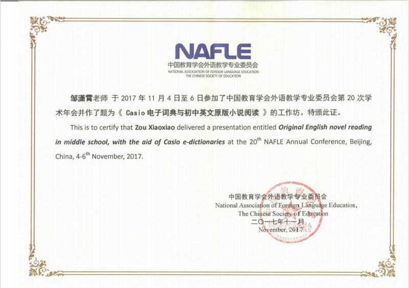 初中英语组邹潇霄老师在课堂教学设计专题会场做了题为“Casio电子词典与初中英文原版小说阅读(工作坊)”的主题发言。李卓老师在高中英语录像课展示研讨会场做了关于人教版高一英语必修一第5单元Elias’ Story的说课研讨与录像课展示并获优秀课例奖。