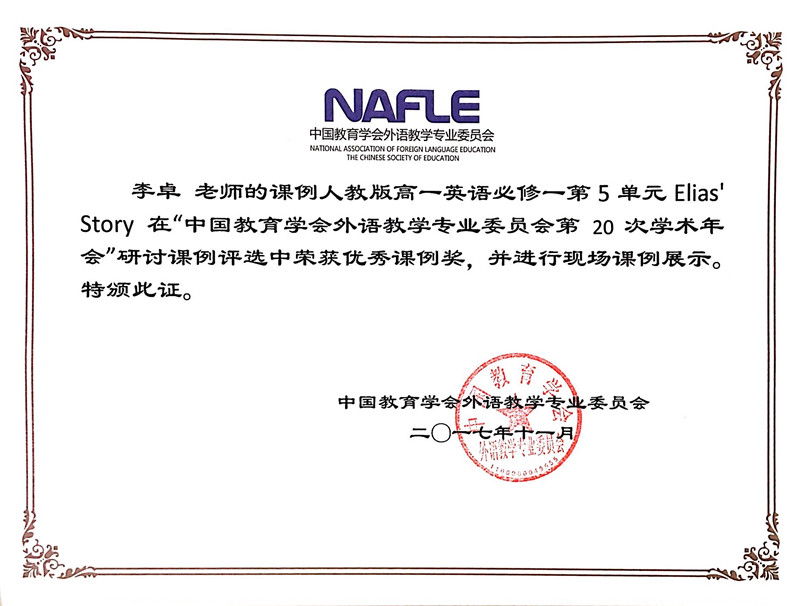 我校李卓老师的高中英语课例从全国各地选送的上百个高中英语录像课例中脱颖而出,成为本次学术年会高中英语录像课展示与研讨的四个优秀课例之一。辽宁省基础教育教研培训中心英语教研员李静对李卓老师的录像课做了专家点评,对我校学生出色的语言功底、较高的文化素养、老师对文本的深入解读及课堂活动的巧妙设计做了高度的评价,并向李卓老师颁发了本次学术年会研讨课例评选优秀课例奖。