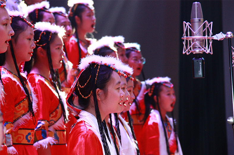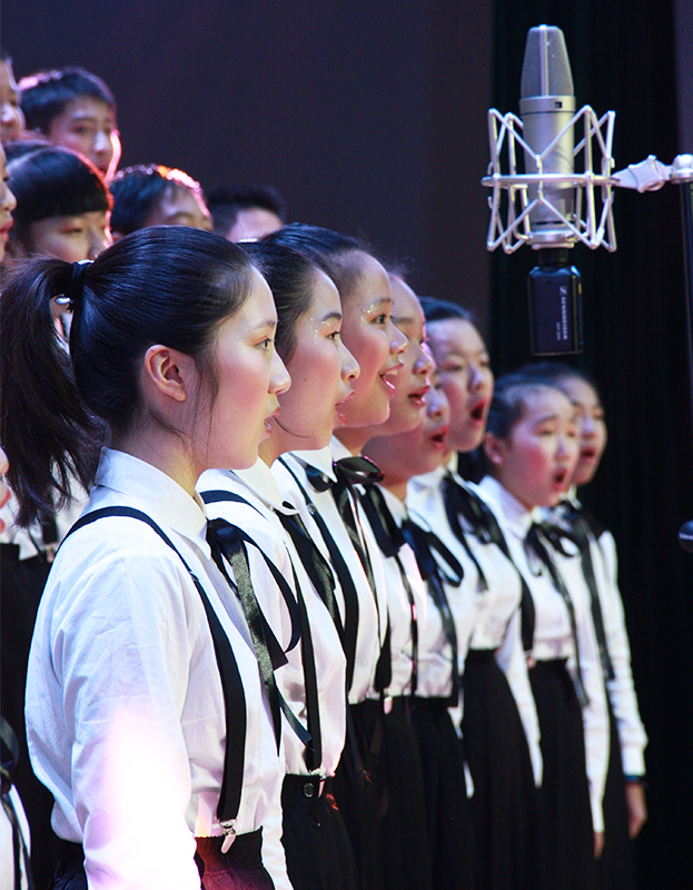 初一年级的同学们演唱了《妈妈格桑拉》、《Over the rainbow》、《让我们荡起双桨》和《Siyahamba》四首歌曲。刚进入中学校园的他们大多还没有完成变声,用纯净的童声诉说着歌声中的情感。