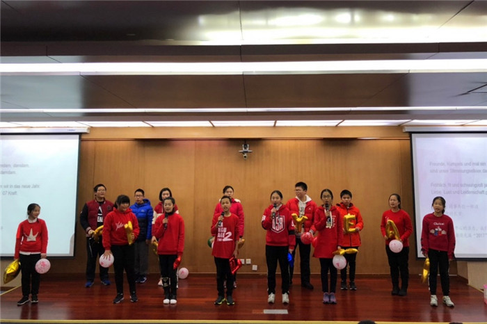 随着新年钟声的背景音乐响起,德语班同学的歌曲《Neuyahrslied》作为开场曲,几位主唱坚定而悠扬的歌声令大家欢呼起来,每个人都诚挚地为大家送来新年祝福与希望。