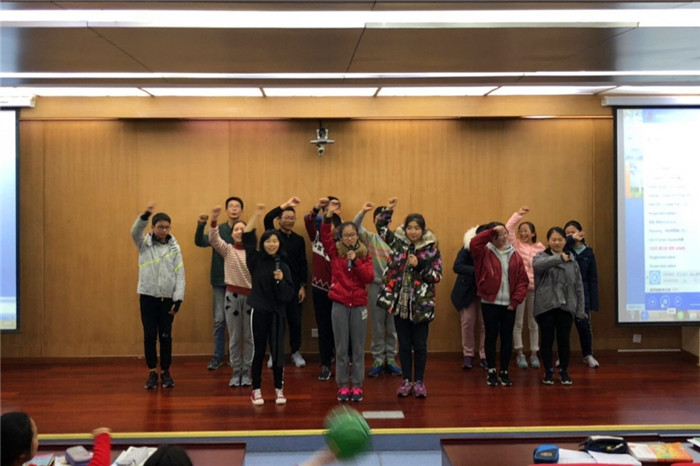 紧接着,大家惊呼起来——舞台上有一只叮当猫!在精美的PPT的放映下,他们演唱的《哆啦A梦(ドラエモンの歌)》唤起了同学们的童年回忆,“哆啦A梦”更是走下台邀请日语老师唐嘉敏上台,与大家一起互动。