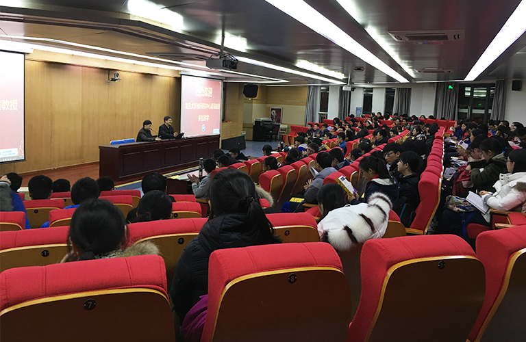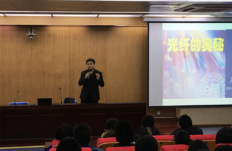 2018年1月10日晚上,复旦大学光纤研究中心博士唐璜教授来到杭州外国语学校作了“光纤的奥秘”的学术报告。学校200多名师生聆听了报告。 唐璜博士就“光纤的奥秘”、“光纤传感的应用”、“光纤技术应用的美好前景”讲述了光纤研究的重要性和科学价值;同时就世界一流大学的培养理念和规划作了详细地解读,并简要介绍了复旦大学的专业特色及招生情况,希望大家努力学习,将来有机会考入复旦大学深造,培养创新精神和实践能力,为成为创新人才而奋斗。
