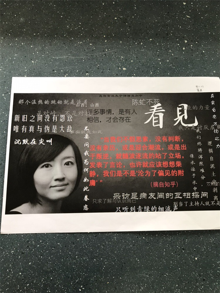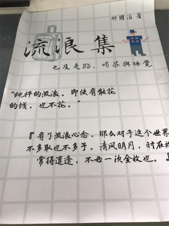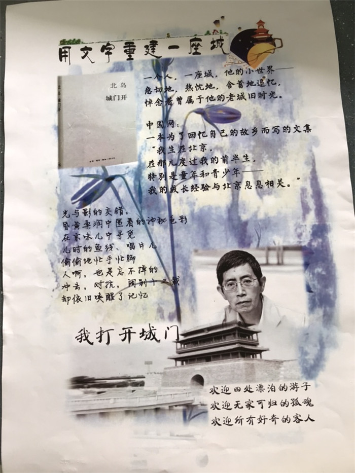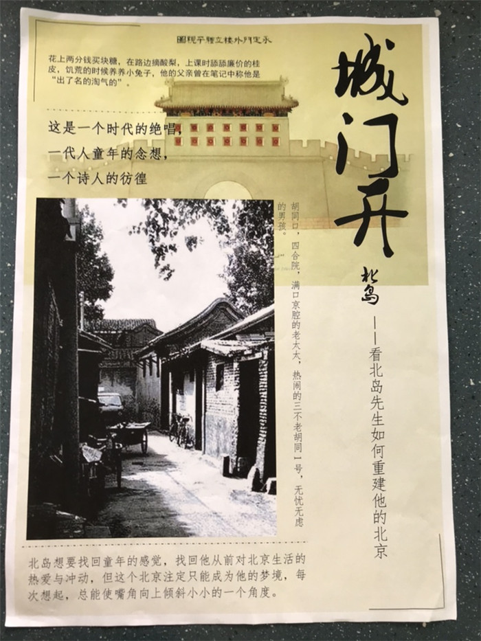 我想正如同北岛所说的一样,每本书其实都是一座丰富的城市。那里“时间倒流,枯木逢春,消失的气味儿、声音和光线被召回”,而作者就是一个守城人,“打开城门,欢迎四海漂泊的游子,欢迎无家可归的孤魂,欢迎所有好奇的客人们。”好奇的客人又带来了更多客人,而那些新客人要做的,就是在快速行走的同时,稍稍在展板前停留;就是在紧张的学业之余,还有与作者共“饮酒”的雅兴;就是在一张张海报背后,发现自己一直渴求的东西——在读完一本书后谦卑地总结,诚挚地分享,把阅读真正当成一件属于“全民”的事情。