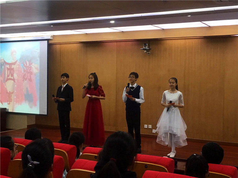 4月12日,初一年级在二号楼1楼报告厅举行“品读名家经典,重温西游故事”活动。
