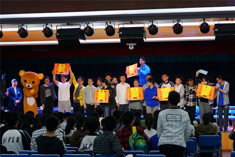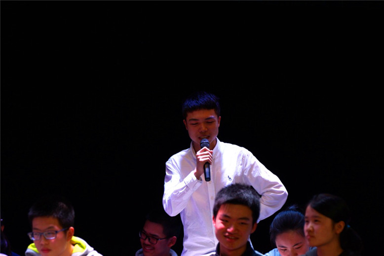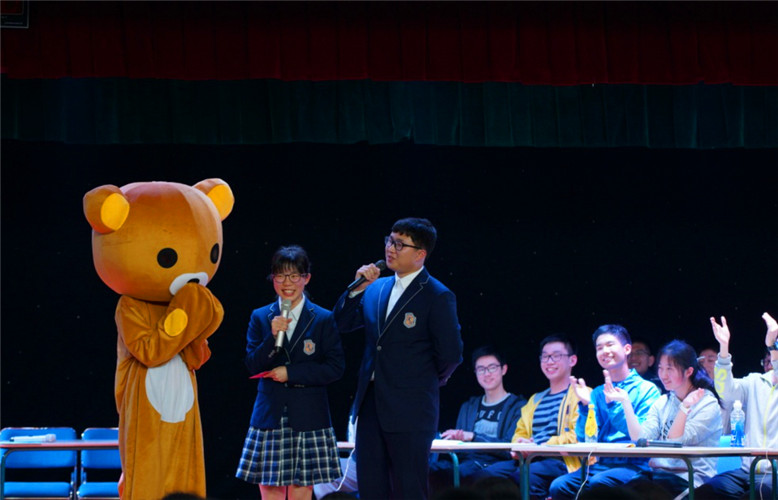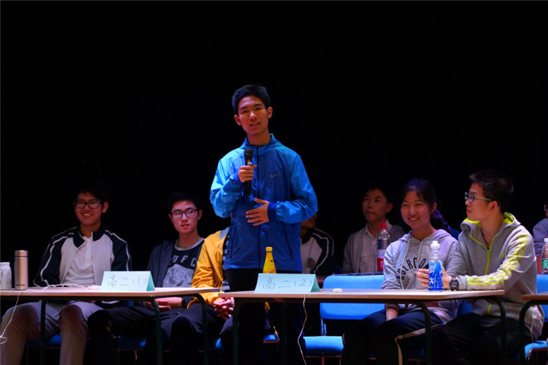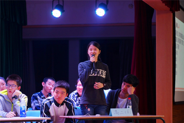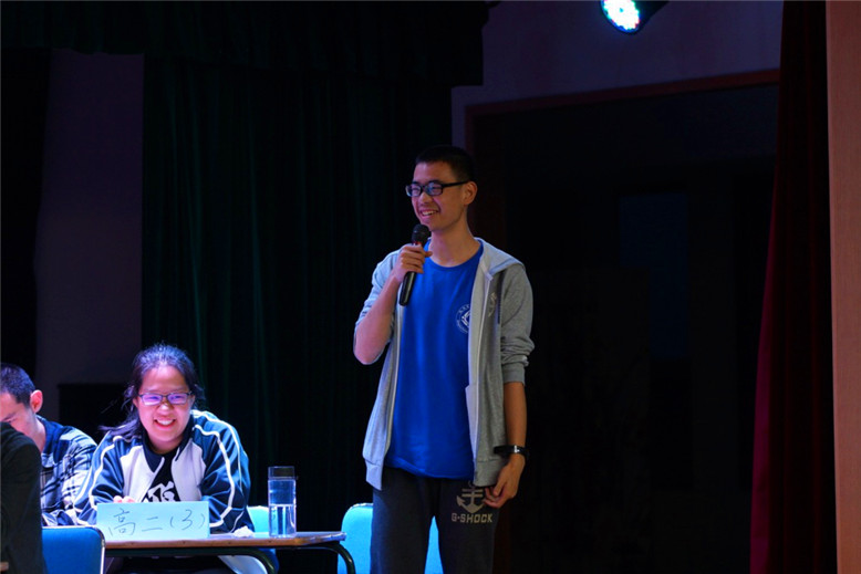 首先,高二各班的选手介绍了本班战队名称和口号。五花八门的名称、铿锵有力的口号,激起了场下的阵阵欢呼。简短的演示轮过后,第一轮车轮战正式开始。车轮战共两轮,每位选手依次答题;选手答对一题将给战队加上十分;如对答案没有把握,还可以求助后援团的同学;两轮都答错的同学将被淘汰。题目涵盖文学、历史、地理等多个领域,结合了课内外的知识,对答题选手的知识水平要求极高。紧张和惊喜在比赛中并存,不少同学在答题过程中用上了每人一次的询问后援团的机会。最后,只有一位四班的同学被淘汰,而大多数参赛选手都顺利通过了车轮战的考验,进入了之后的自选题环节。