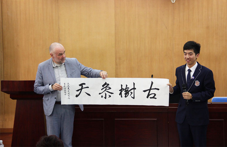 见面会由高三同学制作的视频开始。视频中,同学们以”Thank you, HFLS; Hello, UTSC”为主题表达了对母校的感谢和对大学生活的期待,最令人难忘的部分是家长代表对同学们的叮咛与祝福。“照顾好自己”、“开拓眼界”、“莫负青春”,这些话语无疑在现场家长中引起共鸣,台下传来阵阵掌声。即将前往大洋彼岸的青年们虽然在青涩的嬉笑中看完了视频,却已珍藏了这份来自亲人的温暖。之后是绿色通道项目的同学们带来的poems and songs节目串烧。整个环节以歌曲《Auld Lang Syne》为主线,其间穿插了诗歌《O! Me! O! Life!》、《The Road Not Taken》、《Horace’s Odes(节选)》和歌曲《美若黎明》。节目的最后,胡虞铠同学代表大家赠与多伦多大学士嘉堡校区一幅书法作品——“古树参天”,即多伦多大学校训”As a tree through the ages”中文翻译。二十五位同学来自五个不同班级,却因为多伦多绿色通道项目走到一起,展示了极强的凝聚力。“We’ll take a cup of kindness yet, for auld lang syne.”同学们感恩过去,展望将来。他们不会忘怀在杭外的点点滴滴,不会忘记老师、家长和伙伴们的关怀,将在多伦多大学创造新的难忘回忆。作为远赴重洋留学的中国学子,他们将成为文化的桥梁;作为当代的青年,他们也是连接过去和未来的桥梁。