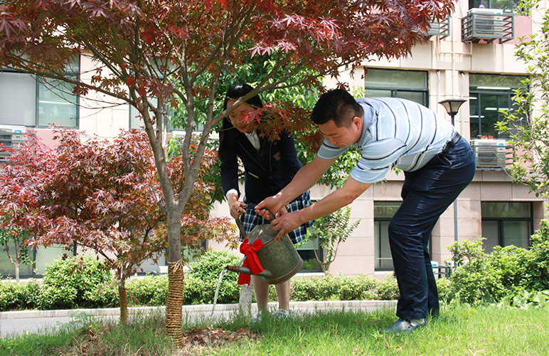 两位校长与陈丹青、舒玥两位学生代表一同给所赠的日本红枫浇水