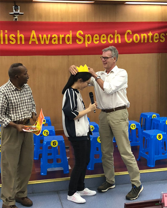 期间,中场休息时简单又有趣的游戏,也让场下观众积极参与其中。休息结束后,后半场的比赛更加紧张激动。难度上升、淘汰加快,短短几轮后,场上便只剩下三人了。最后,高二5班付意嘉同学凭借雄厚的实力和稳定的发挥夺得本次比赛的“spelling bee”称号,摘得了单词拼写之王的桂冠,高二5班获得了团体优胜奖。