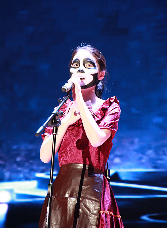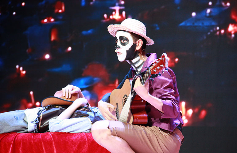 由初二初三学生组成的“Coco”剧组(《寻梦环游记》),呈现了现实与亡灵世界的追梦与亲情, 一开场就是一段热辣的拉丁舞伴上节奏感极强的音乐,让人不难想到,这是一个关于音乐的故事。