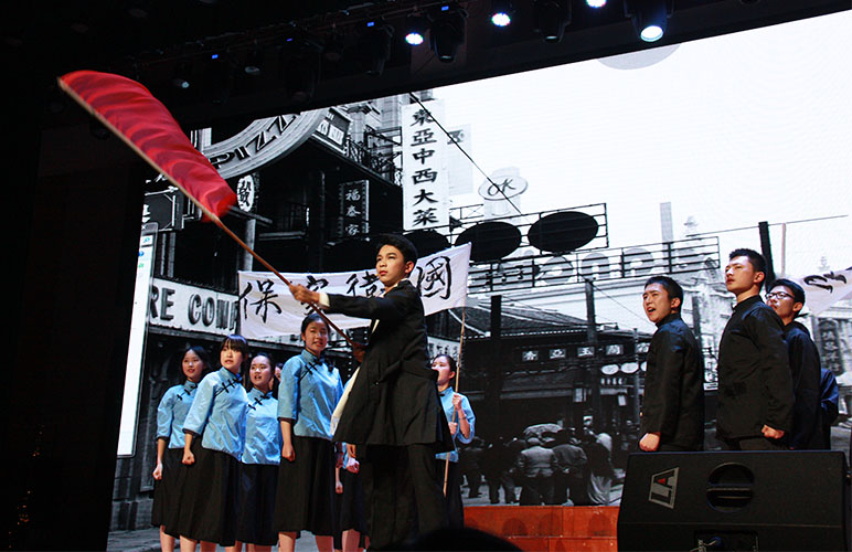 由高一高二的同学们组成的《上海滩》剧组为大家呈现了一场原汁原味的穿越体验。大幕拉开之时,是身穿学生服,手持横幅的青年学生们,那一句句“还我山河”,一声声哀叹和怒吼仿佛无时无刻不昭示着那个厚实凝重的年代,与那混杂绝望与救赎,泛着猩红的——上海滩。