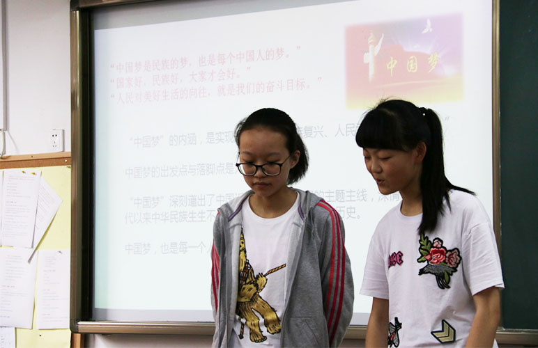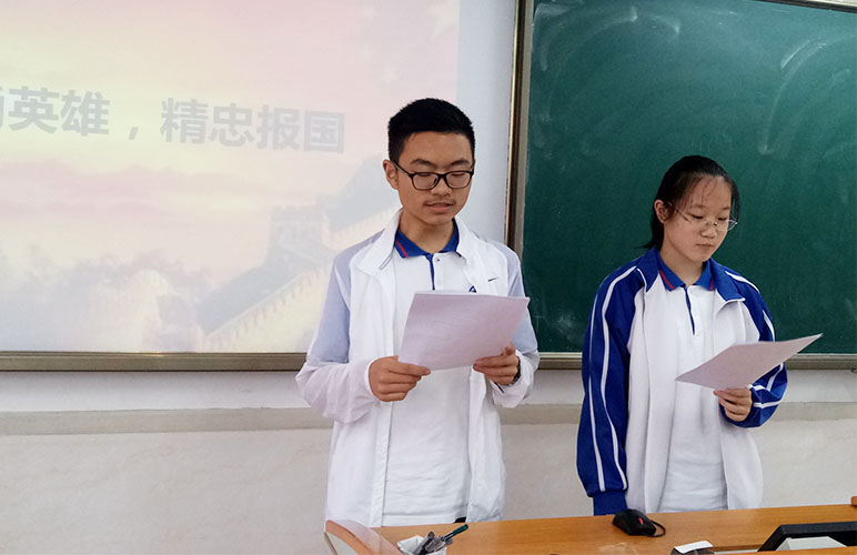 窗外的小雨淅淅沥沥,但这无法影响教室内同学们的热情。5月21日,随着主持人程灿和侯宇桐的上台,同学们暂时压下了满腔热情,一双双眼睛齐刷刷地看向讲台和大屏幕。“大家好,今天由我们第五组为大家带来主题班会《崇尚英雄 精忠报国》。”随着程同学中气十足的一句开篇词,主题班会正式开始。