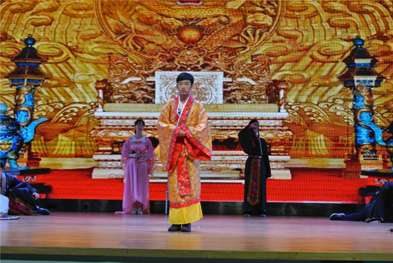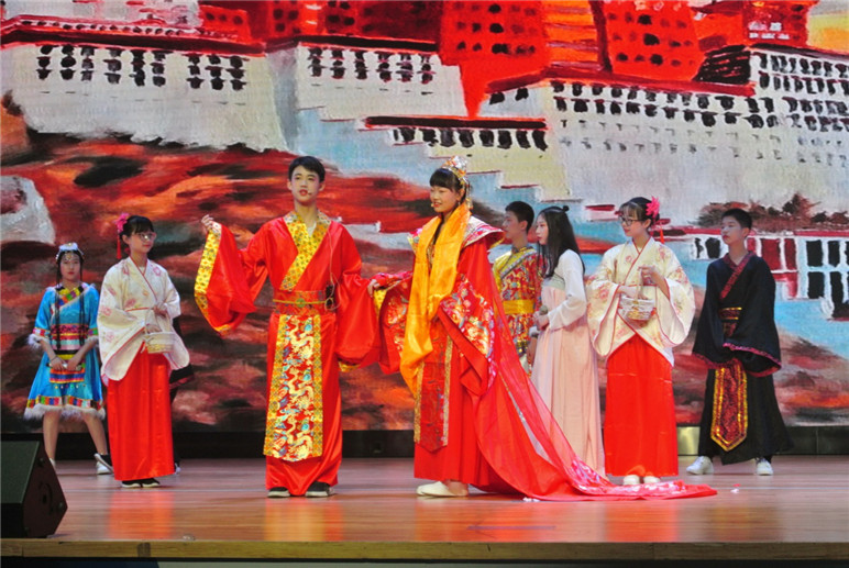 1班带来的《Princess Wen Cheng on Her Journey of Love》,一个为中国人所津津乐道的故事。这组的同学们准备十分充分,服装华丽,动作、表情到位,完美再现了文成公主进藏的场面。