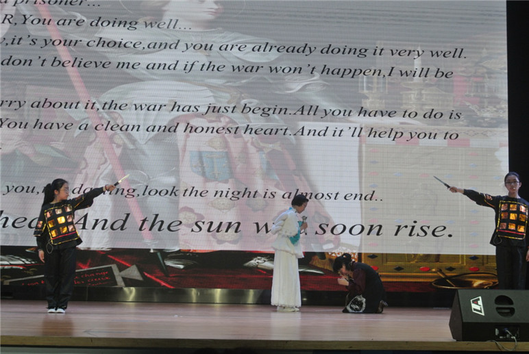最后一场压轴之作是4班带来的《Joan of Arc》。尽管和第五个表演的是同样的主题,却演出了不同的特色。他们的表演展示了Joan较完整的一生。Joan悲伤时肠断欲绝,激动时激情澎湃,把圣女贞德的一颗火热的爱国心演绎得淋漓尽致。