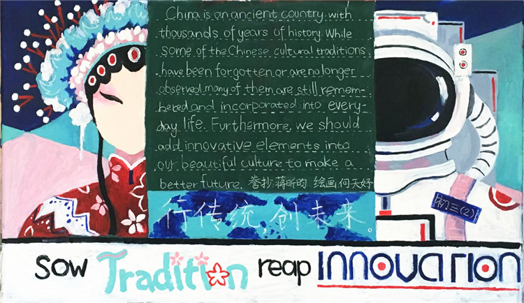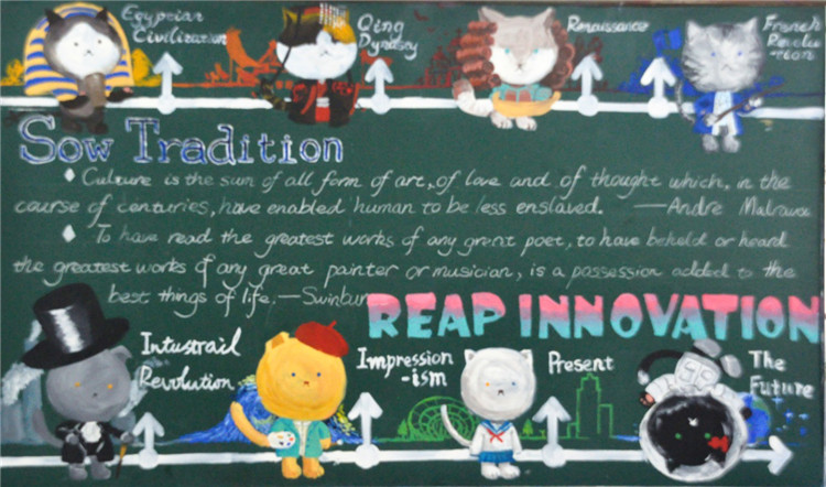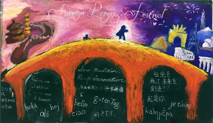 外文节期间,我校组织主题板报评比活动,各班级积极准备,板报设计紧扣本届外文节主题——“Sow Tradition, Reap Innovation行传统,创未来”,精心设计,歌颂经典,继承传统,畅想未来,展现出了我校学生良好的语言文化与艺术素养。