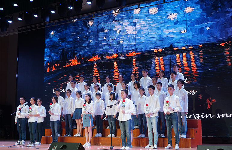 高一4班的主题是艺术,同学们将诗歌表现的范围缩小到绘画,着重表现了梵高这个不幸而又伟大的艺术家。节目借鉴了《挚爱梵高》电影的剧情,先由一个邮递员引出梵高这个人物和他人对他的看法。朗诵内容是《Vincent》的歌词,开头融合了歌唱的形式,PPT上的动态图也起到了锦上添花的作用。