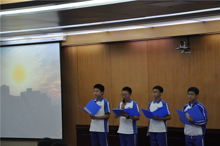 这是我们班第一次独立举办年级的活动,从前期策划到方案成型到最后现场表演,四位主持人分别来自初一3班的徐一平、许允晟、陈卓尔和张承非同学,他们做了精心的准备,反复地排练,确保以最佳状态出现。孔象象同学则全程给予了幕后技术支持,一张张精美得体的幻灯片都出自他的创作。总之,一场活动的顺利演出需要每个人通力合作,这是我们在欣赏诗歌之美的同时得出的另一个启示。