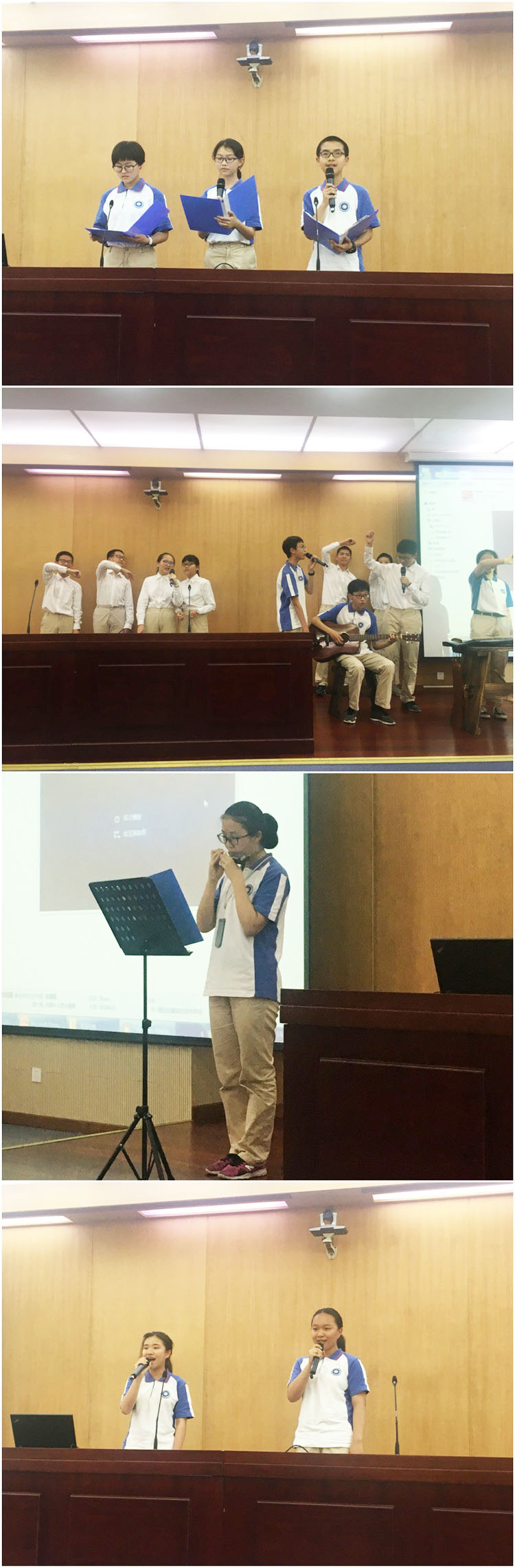 最后是各班同学精心准备的串场节目。1班的张逸瑞、谭嫣然、诸葛敬三位同学为我们深情朗诵了《和红领巾相伴的日子》,在抒情的音乐中,我们仿佛走进了回忆;2班为大家带来了朗诵及歌舞串烧《从童年到少年》,再次将现场的气氛推入高潮;3班的段语嫣同学表演了口琴独奏《天空之城》,琴声悠扬,丝丝入耳;4班的邵帅、王越同学为我们带来了一首悠扬的古风歌曲《千丝戏》,旋律动人,歌声悦耳。