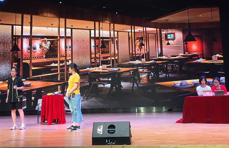 《暗恋桃花源》是台湾剧作家赖声川的著名剧作,讲述了一个奇特的故事:“暗恋”和“桃花源”两个不相干的剧组,都与剧场签订了当晚彩排的合约。演出在即,双方不得不同时在剧场中彩排,所以出现了一出古今相对、悲喜交错的表演。我们剧组男女比例恰当,使得角色很快敲定下来。一开始,我们剧组里的男同学都比较淘气,常常走神、打岔,而剧本身又是两个剧合成一个,管理、组织起来非常困难。组长选择将《暗恋》、《桃花源》分开排,但这样进度也很慢,很让人担心最后效果呈现出来的样子。到了后期,两位组长的领导力开始发挥作用,在她们的管理与指导下,不仅服装与道具准备得十分全面细致,负责道具的同学也十分敬业地去买了古装、喝空了玻璃瓶,几个男孩子也自发地组织排练,设计与纠正细节,甚至还抽出晚自习的时间来练习、背词。尤其是《桃花源》组的两位老陶和袁老板,互帮互助、不断揣摩,提高演技。刘老板有丰富的舞台经验,认真地给有些怯场的老梅做示范,从表情到动作,帮助他更好地理解人物感情,从而更好地诠释“老陶”一角。
