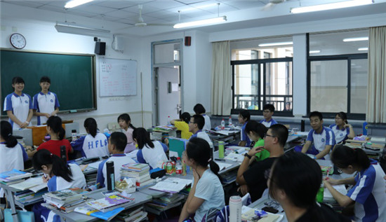 侯同学首先带着大家回顾了一下丰富多彩的暑假:社会实践活动、出游、一点点作业。大屏幕上出现了许多同学分享出来的照片,一张张笑脸出现,勾起同学对暑假的美好回忆。第一个环节为暑假分享,同学们踊跃发言,纷纷将各自的快乐分享给大家。随后,班会进入重头戏——开学第一课。