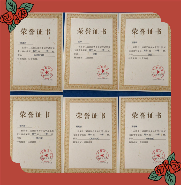附2:第十二届浙江省少年文学之星征文比赛一等奖获奖学生和指导教师奖状