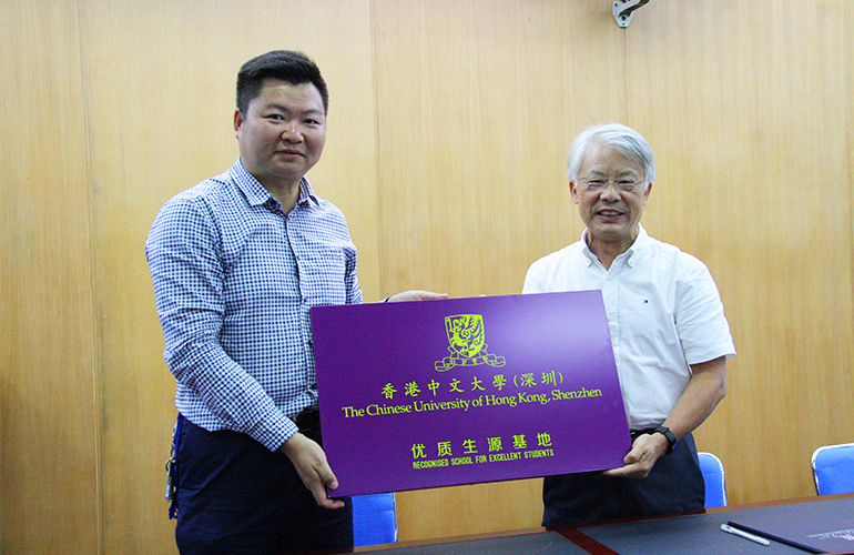 2018年9月28日,香港中文大学(深圳)副校长、加拿大皇家科学院及工程院院士、国家“千人计划”特聘专家朱世平教授到访我校,并为我校颁发优质生源基地牌匾。张俊峰副校长代表学校与香港中文大学(深圳)签订共建优质生源基地合作协议书,并接受牌匾。办公室、学生处等部门负责人及本部高中学生代表参加仪式。