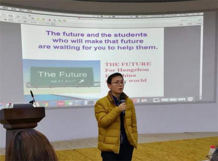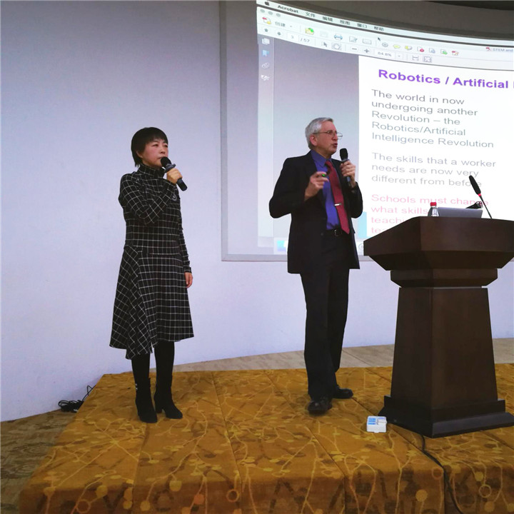 我校通用技术教师张鹏峰老师被邀请作为本次活动Jake教授的现场同声翻译,张老师凭借她出色的英语口语能力和对STEM的深刻理解给大家带来通俗易懂的知识和理念。