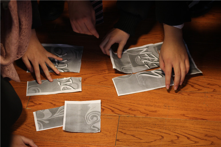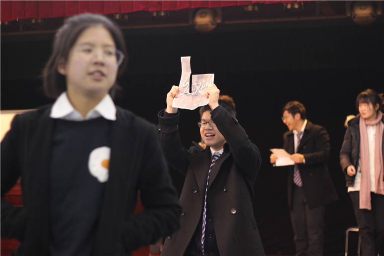 第二个游戏叫做拼图传递战,规则如下:计时员示意后,四个班级同时开始传递提前随机分配的八张卡片(一位同学负责传递台下随机发放的卡片给台上的同学)。台上的4位同学协作进行拼图,台下的同学负责辨识台上拼图所指向的单词,最先举手并喊出该单词的同学所在的班级为胜。从本活动可以看出其实任何一个活动的组织和完成都会含有以下角色:灵感者——想出以何方式开展活动;指挥官——具体领导如何开展活动;执行官——最终执行活动的开展方式;传递者——协助执行者进行活动。这个游戏很集中地体现了在一个团队中如何实现领导力。一个领导者就是要协调好各个角色的能力,充分发挥团队的力量,做到1+1>2。