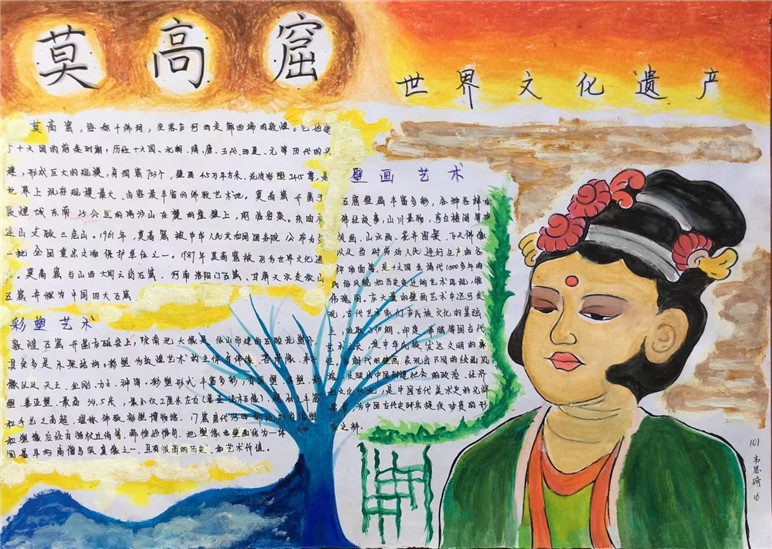 莫高窟是古建筑、雕塑、壁画三者结合的艺术宫殿,古典文化艺术的宝库,也是举世闻名的佛教艺术中心。因此,我在制作画报时,在内容上介绍了莫高窟的总体情况,重点介绍了彩塑艺术和壁画艺术。在插画方面,我主要运用的绘画工具是水溶性炫彩棒。因莫高窟建立在鸣沙山的断崖上,所以我以黄土为主色调。在莫高窟附近,有扬名中外的月牙泉,我以深蓝和银白绘制。因近几年来黄土高原沙漠化严重,我以青绿色的藤曼表达对了黄土高原早日绿色化的憧憬。在画报的右下角,是我模拟的洞窟壁画,以此弘扬莫高窟的传统文化。