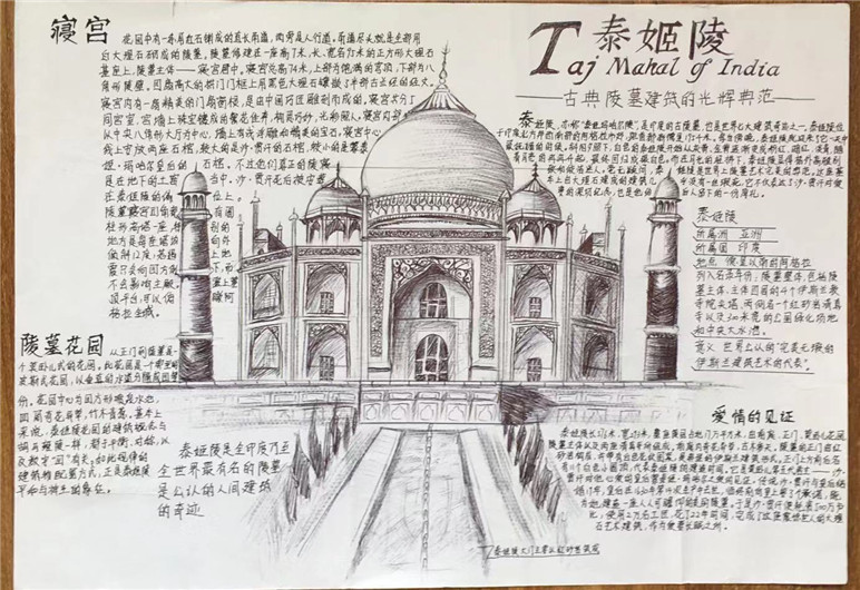 完成这幅小报且使它完美便成了我的目标。我采用居中格式,以一比一的图文比例绘制。我想充分表现泰姬陵外观的震撼与那独特的对称之美,便用圆珠笔为其绘上淡淡的阴影,并用尺子测量此建筑左右的比例,努力使它有立体和对称感;同时,我搜集了大量的资料,除了一些述说其历史的文字外,还有许多我整理出的有关沙·贾汗建造泰姬陵的小故事和一些泰姬陵内部的描写。因为我想表现的不仅是它的艺术价值,还有一些巨大的历史价值和意义。泰姬陵美丽的不止是它的外表,还有它背后的历史故事那悠悠的韵律。