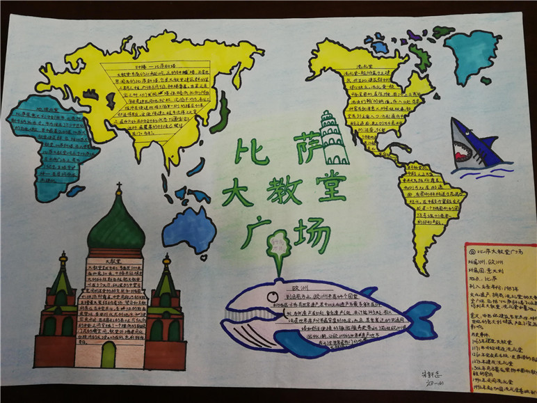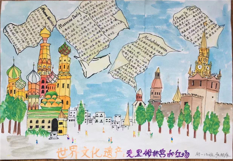 其实,最早想做历史与社会的世界遗产作业的契机是因为俄罗斯世界杯,这次世界杯让我彻底地爱上了俄罗斯。在书中偶然翻阅到克里姆林宫和红场时,我被那不可阻挡的魅力彻底吸引了。我开始构思这幅小报的框架。我希望它简单而不失趣味,又希望它能几乎毫无瑕疵。我恨不得我手中的画笔可以和马良神笔一样神奇。