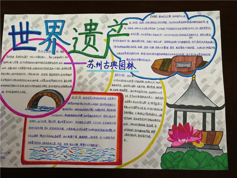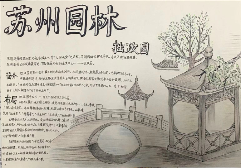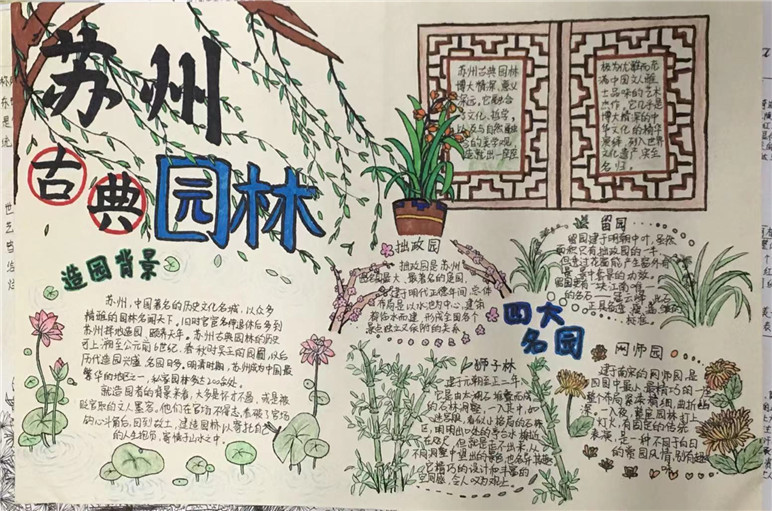 因为要结合园林中的景物,所以我要画出许多花草树木,在勾线和上色的过程中会有很多麻烦,需要花费很多时间和精力。这需要很大的耐心和毅力去完成。我花了将近四个小时才将它完成。在我画花草和窗子时,需要翻看曾经去苏州园林的照片,并照着照片设计元素。这不但有助于提高我的画技,也锻炼了我的耐力和我的坚持力。完成之后,看着丰富多彩的小报,感觉心中很有成就感,这样的作业让我的生活更加充实有趣,开拓了我的视野。