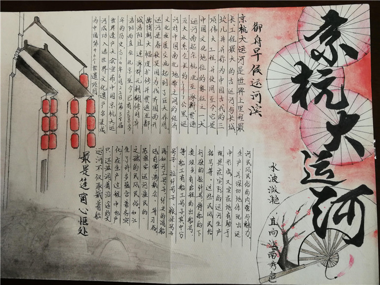 这份历史小报的作业很有趣。我做的小报的主题是苏州园林。因为我曾经去过苏州园林,亲身感受过园子中柳暗花明的情趣。我便一边回忆,一边做起小报来。整张小报融入了园林中的景观,古朴的楼窗,雅致的垂柳、荷塘,以及另外加入的梅兰竹菊等元素。这仿佛让我回到了苏州园林,又通过资料更深入地了解了它,一份小报就这样完成了。