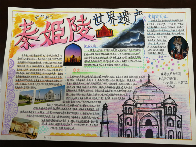 整张小报完成历经3小时,其中不乏一些关于资料选择上的犹豫不决以及绘画下笔时的考虑。但这几个小时却也让我受益匪浅。泰姬陵这颗“印度珍珠”背后的故事,文化,是历经这3小时之后仍然让我记忆犹新的。也许今后绘制泰姬陵的机会少之又少,但这一次制作给我带来的那种来自异国文化独有的震撼与思考却是深刻的,也许今后这类建筑带给我的不仅是片面的赞叹,而是有对其背后历史的思考与感悟。