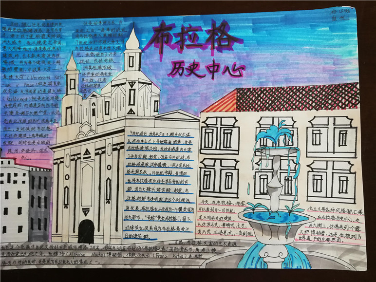 接下去我开始思索,怎样在方寸之间呈现这座具有文化和历史底蕴的城市呢?闭上眼,我开始回想,里昂被称为“粉色心脏”,令我印象深刻的是旧城纵横错杂的古老街巷,各具特色的欧式建筑,神圣庄严的大教堂,和五彩斑斓的彩绘玻璃……我决定用图文并茂的形式完成小报。我拿起彩铅,参考旅行拍下的照片,在醒目位置画下旧城古朴的街道和建筑。接下去,文字部分我通过在网上、书籍查阅资料,介绍描述里昂的地理位置、自然景观和文化历史,希望能多方位角度让大家了解这座城市。