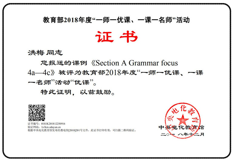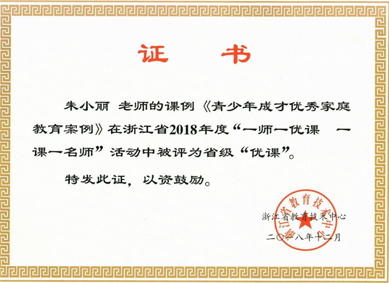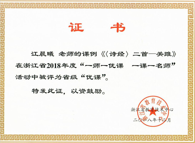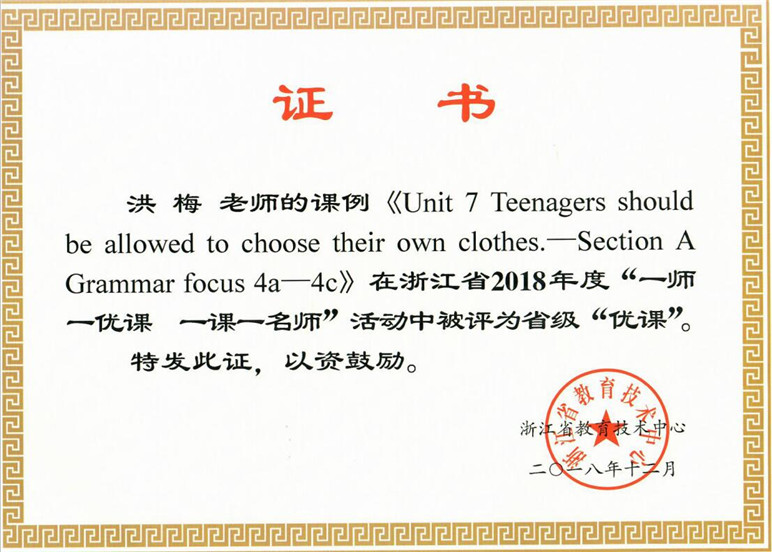 近日,我校收到了浙江省教育技术中心和一师一优课平台颁发的获奖证书,朱小丽、洪梅2名老师的课例获评部级优课,朱小丽、洪梅、江晨曦3名老师的课例获评省级优课。