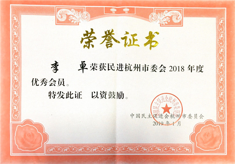 我校外文组李卓老师作为中国民主促进会会员,在做好本职工作之余,积极参政议政,热心社会公益,被中国民主促进会杭州市委员会评为2018年度优秀会员。