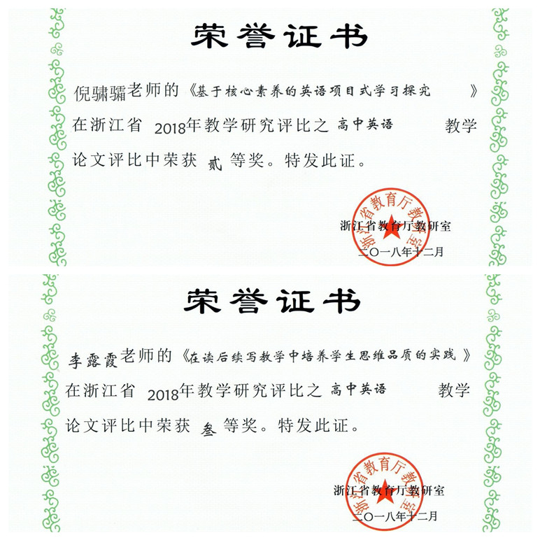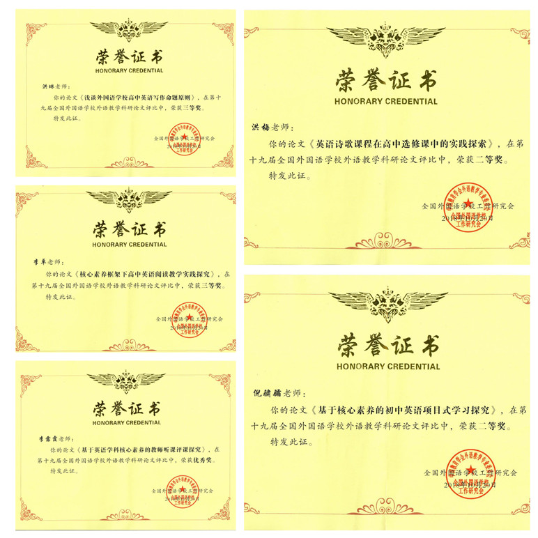 ◎ 4位教师论文分获全国外国语学校外语教学科研论文评比二、三等奖,2位教师论文分获省高中英语教学研究论文评比二、三等奖。