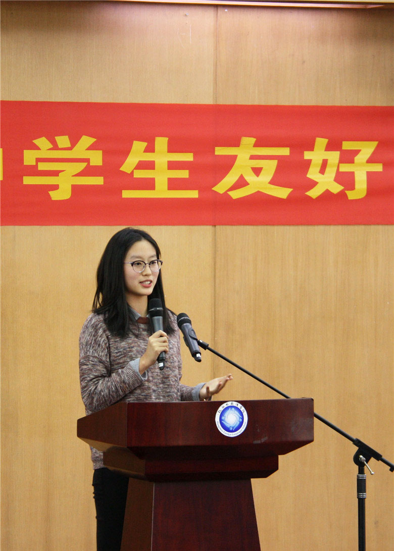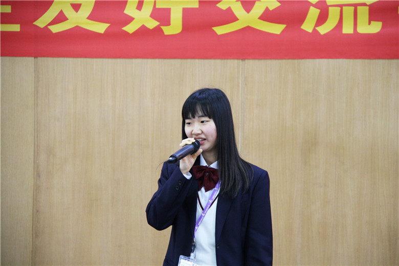 随后,日方久保真理子同学就本次活动的举行,对我校同学所做的准备表达了真切的谢意,她流利的英语给我们留下了深刻的印象。来自高三APU班的李未名同学也与大家分享了她为准备此次活动,制作了近100页PPT的感想,双方老师以及同学都对她制作的精美的幻灯片赞不绝口。