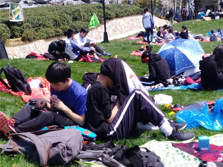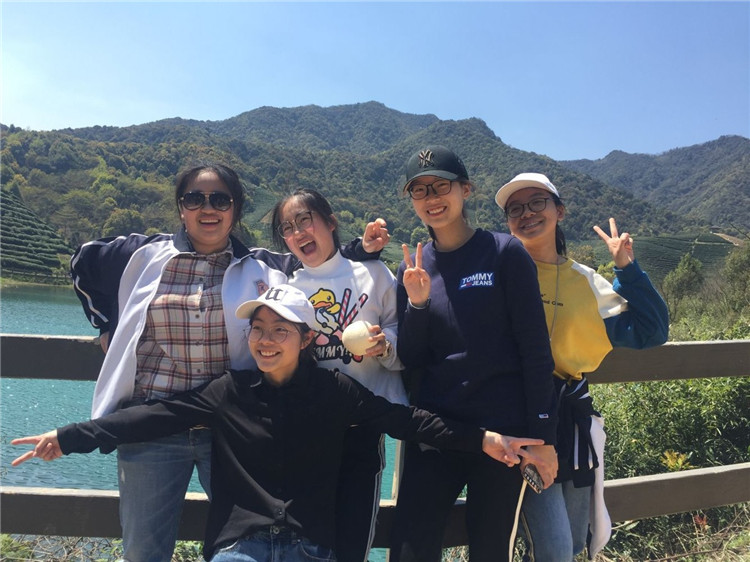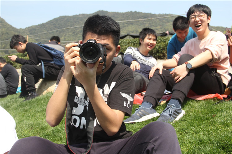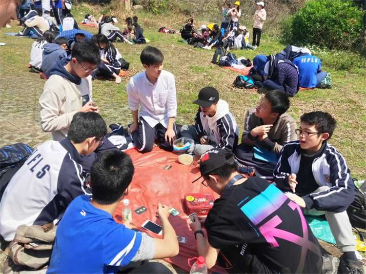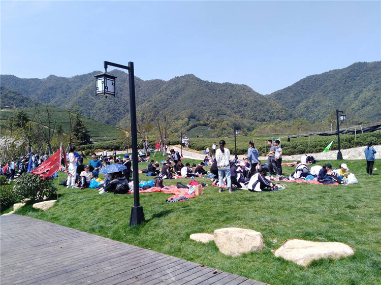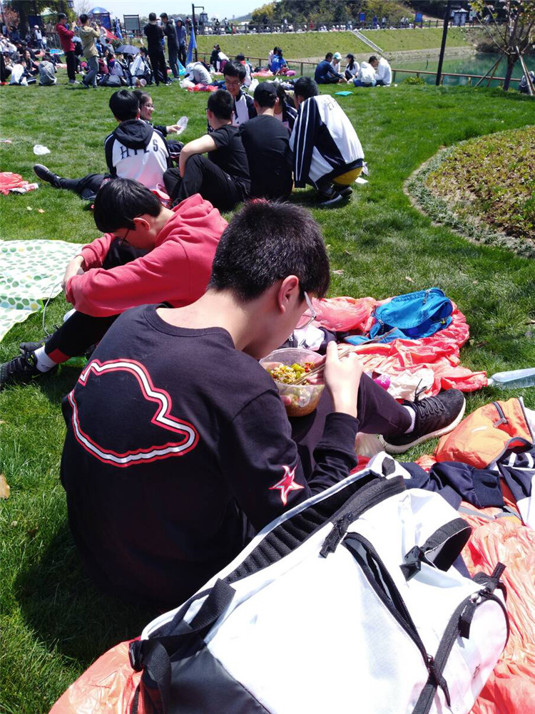 承包了一片草坪后,大家便开始分组安排活动。有呼朋引伴享用美食的,有促膝长谈的,还有的同学返璞归真,类似三国杀、飞行棋这些“小学生”项目被重拾,尽管玩伴换了一批又一批,但游戏包含的的纯真与天然之情愫确是时过境迁仍未改变的。此外,更有一队极具冒险精神的同学探秘后山茶园,初春刚抽芽的明前茶正值采摘季,他们目睹带着艳绿焰红的采茶帽的妇人们正弯腰辛勤地工作着,眼里透出疲惫却满足的目光……无不例外,大家都自觉适可地放下了手机,游戏虽精彩有趣,和同班同学一同沉浸在山水中的玩乐时光却是转瞬即逝且更具意义的。