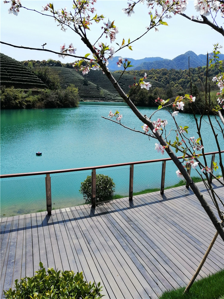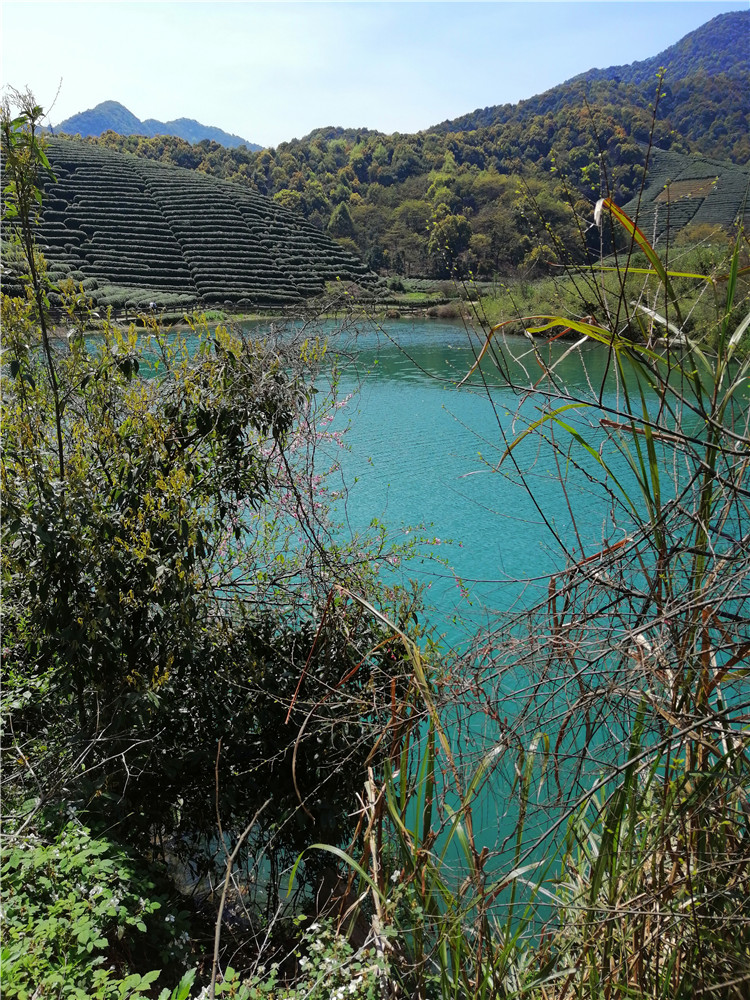 到了骑行公园,群山的主题突然换成了漫山遍野的茶园,茶树随着起伏的小丘缓缓铺开,层层叠叠任由辛勤的茶农们与嫩绿的新茶邂逅。茶园间的碧水微波荡漾,倒映着我们年轻的面孔,望着我们在清风的洗礼下、大自然的怀抱里收获难得的宁静。