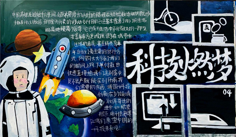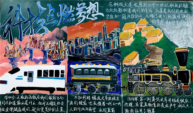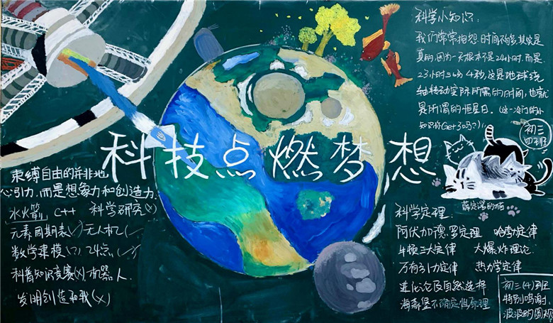 3月底,我校组织开展了科技节主题板报评比活动。初高中各班级精心准备,板报版面设计图文并茂、美观大方,内容较好地体现了本届科技节的主题——“科技点燃梦想”,充分展示了同学们良好的科学与艺术素养。
