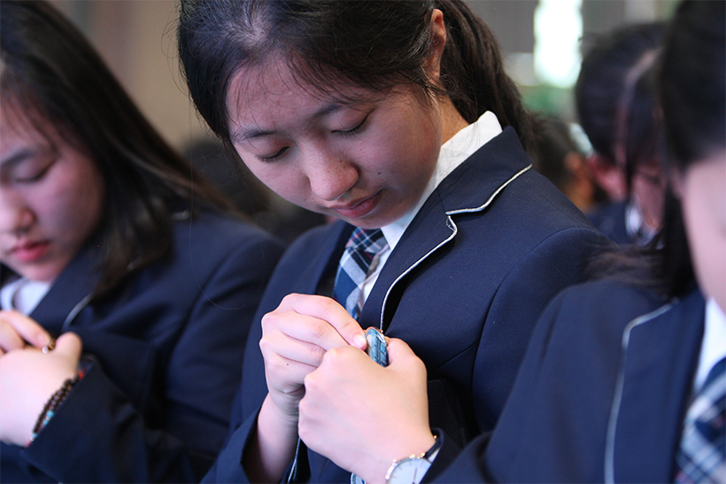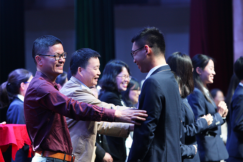 高三同学们在一幅幅幼时与今日的对比图下走过了成人门,领取纪念勋章。一个个象征成长的勋章被无比郑重地交到每一名同学手中,伴随着老师们“长大快乐”的祝贺,每个人脸上都洋溢着骄傲与幸福。佩戴好勋章后,是集体宣誓环节,一句句誓词整齐有力,饱含着同学们的坚定决心与无限期冀,久久回荡。