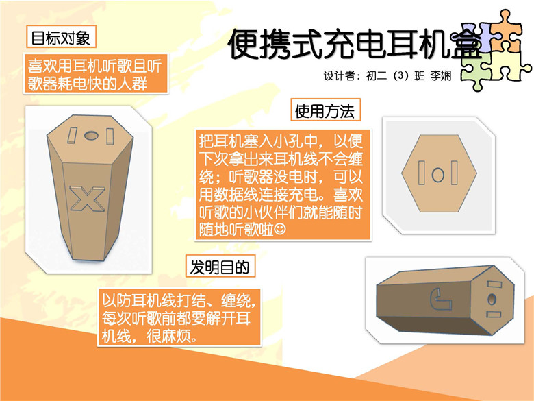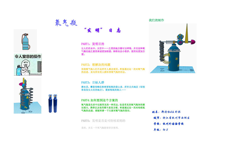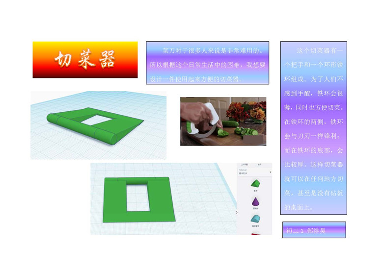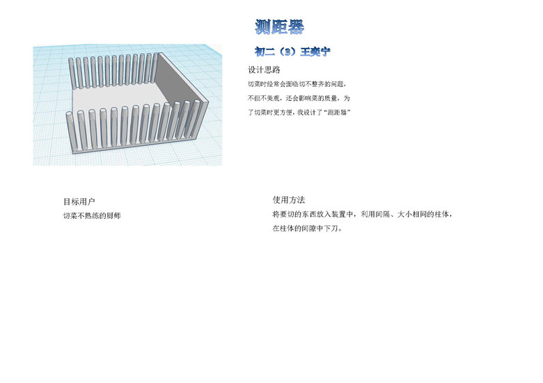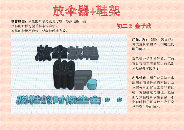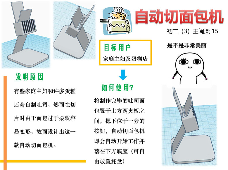 对于3D建模或是发明创造,我向来没什么天赋。这次的小发明能够获奖,真是意料之外。最初在得知要自己发明一件物品,并且用tinkercad制作出模型时,我大脑一片空白。经过老师的一些启发才终于有了大概的思路。