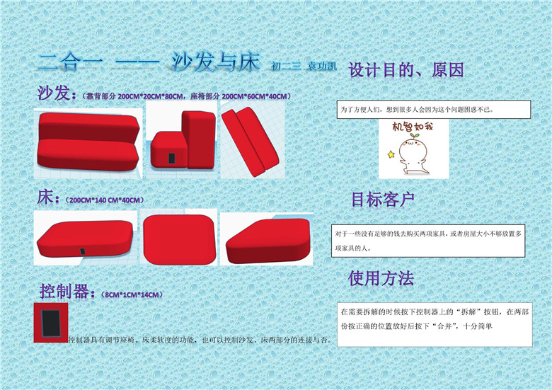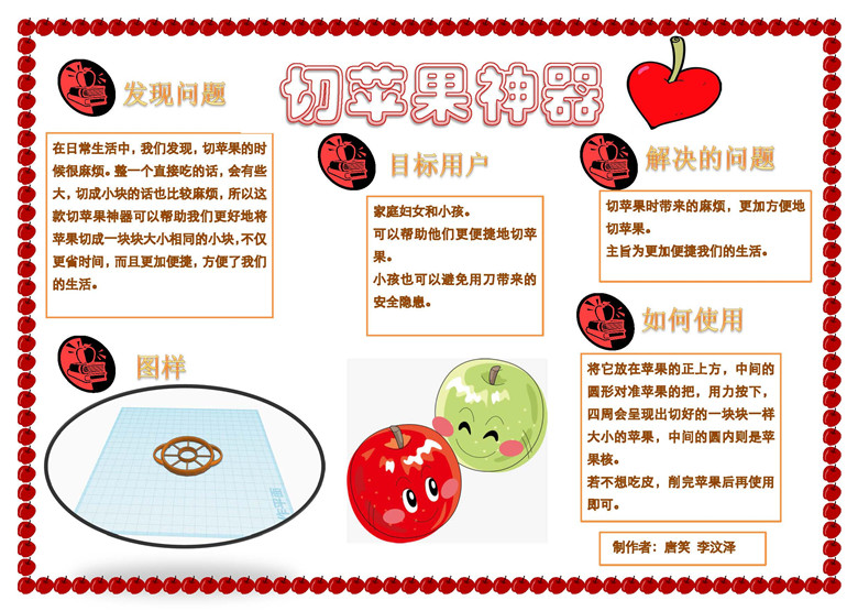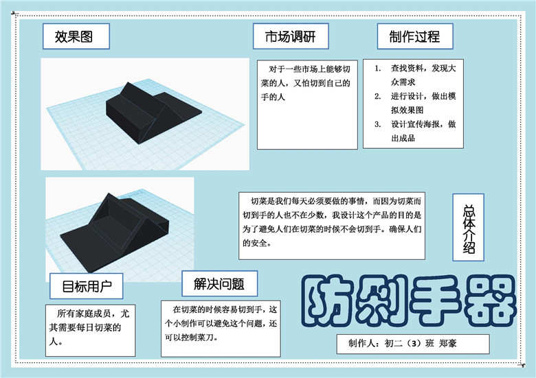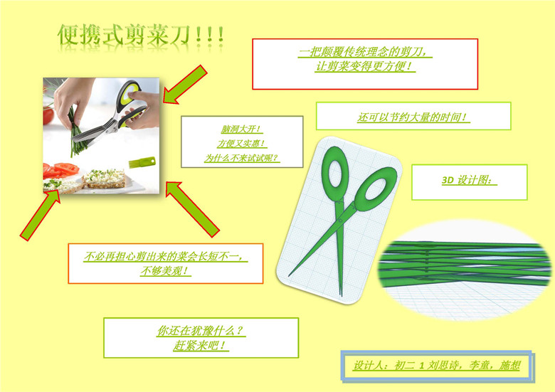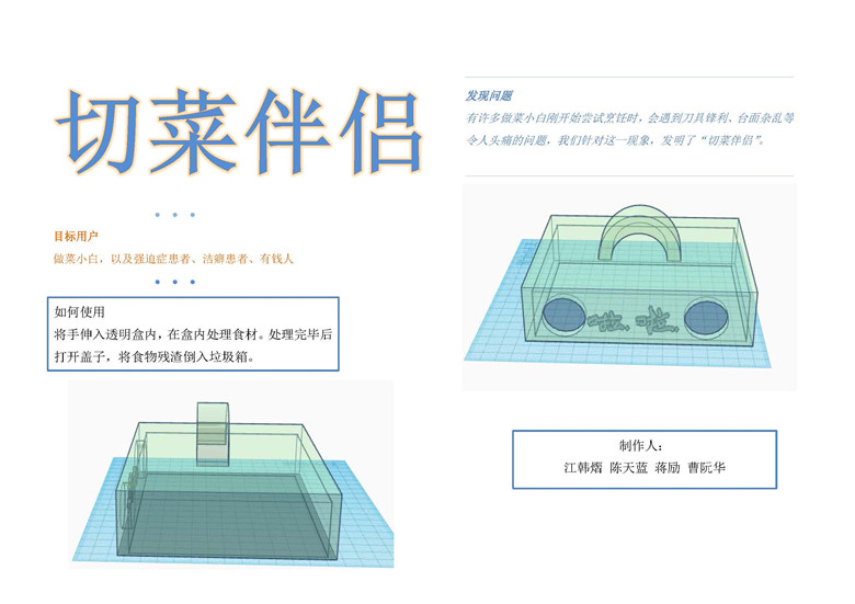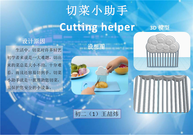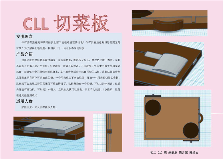 切菜板是生活中较为常见的一样物品,但它在各个方面都有许多不足之处。它十分贴近我们的生活,但从来没有人想过去改善它,于是我们小组就想发明一块高科技的切菜板,使人们使用起来更加轻松。