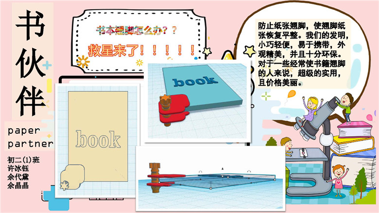 身为一名学生,我们日常生活中面对最多的就是各种各样的作业本和成堆的试卷。而我们三个都面临着一个共同的问题——书翘脚了。为了让自己在老师眼中成为一个干净整洁的好学生,我们的设计灵感就由此而来。