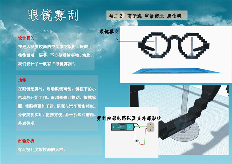首先创新,在高大上之外必须有它实用的价值。于是都戴眼镜的我们便即刻想到了吃面条时眼镜上让我们极其不爽的雾。于是,模仿雨刮器,就来个微型“雾刮”吧。设计好简单的电动机电路,配上美观透明的刮子,就完成啦。