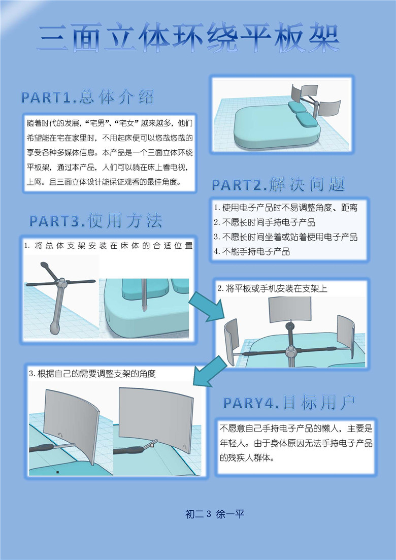 想要设计一个平板架是受到网上一张图片的启发。对于一些四肢有残疾、不能够自由活动的人来说,一个环绕式的平板架可以满足他们对于网络或是使用电子产品的需求。同时这样的设计还可以让像我这样的懒人躺在床上便畅游世界。有了思路,我便直接开始制作了。