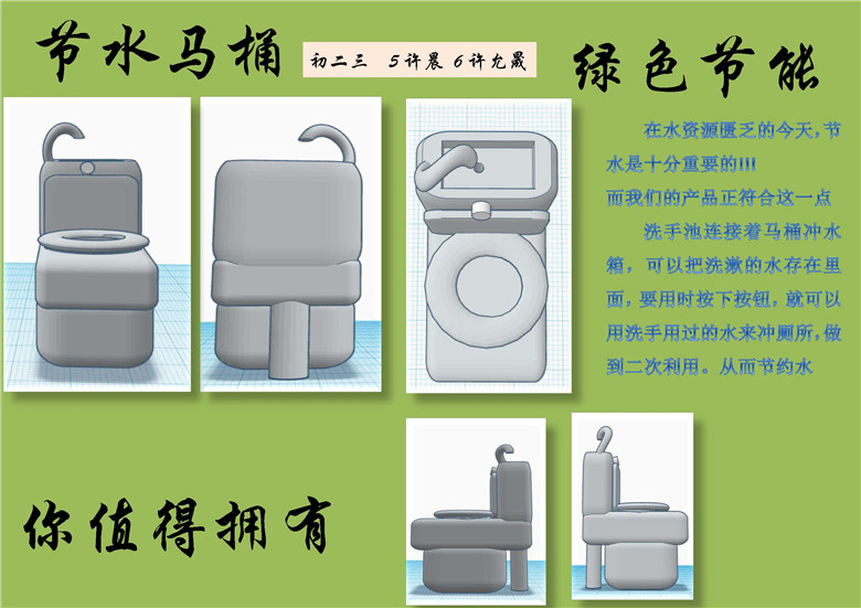 所以我们决定从身边的小事找起。我们开始观察家中浪费水的家具:洗衣机、马桶等等,并尝试想出改进这些设备的方法。最终,我们把目标确定在了马桶上。相较于其他用水设备,马桶用水量更大,但对水质的要求并不高。于是我们开始寻找可以为马桶提供二次用水的物品。我们考虑过洗过衣服的水、拖过地的水、洗完菜的水……但同时又要考虑到提供水的自动性,所以最终选择了洗漱用水。主要是因为洗漱用水离马桶较近且量大,最终为了更方便一点,便直接将水池装在了马桶水箱上,这同时节省了空间,一举两得!